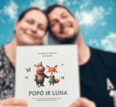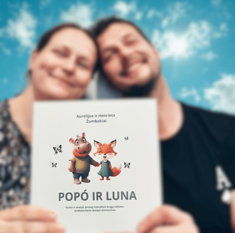 esame Henrieta ir Aurelijus, dviejų mergaičių tėvai ir „Popó ir Luna“ kūrėjai.